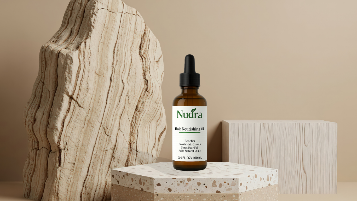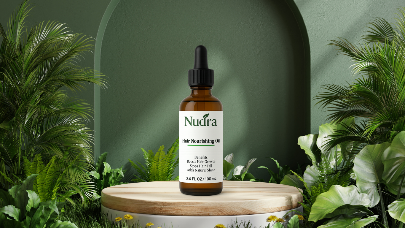 Nudra Hair Nourishing Oil strengthens each strand from root to tip, restoring shine, volume, and confidence naturally.
